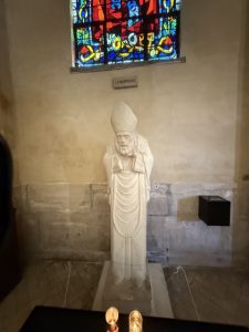 Legend says after being beheaded, he picked up his own head and walked several miles preaching a sermon, before finally collapsing. That’s why he’s usually depicted carrying his head. After learning that, we saw him with 2-3 other statues at other cathedrals.