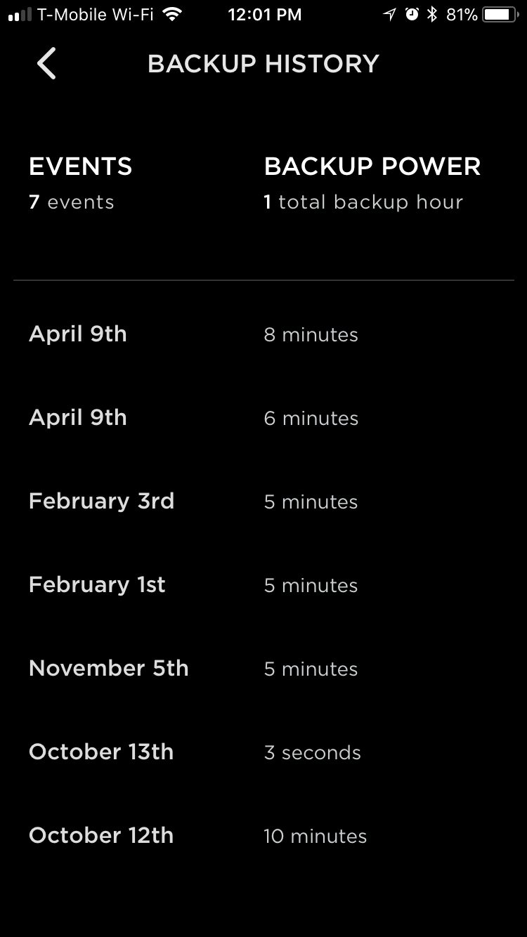 Tesla Powerwalls come with an app that shows you any downtime that the Powerwalls have offset. What I find interesting is that the power has gone out several times over the past few months and I’ve noticed it a whopping 0 times that the Powerwalls had engaged.